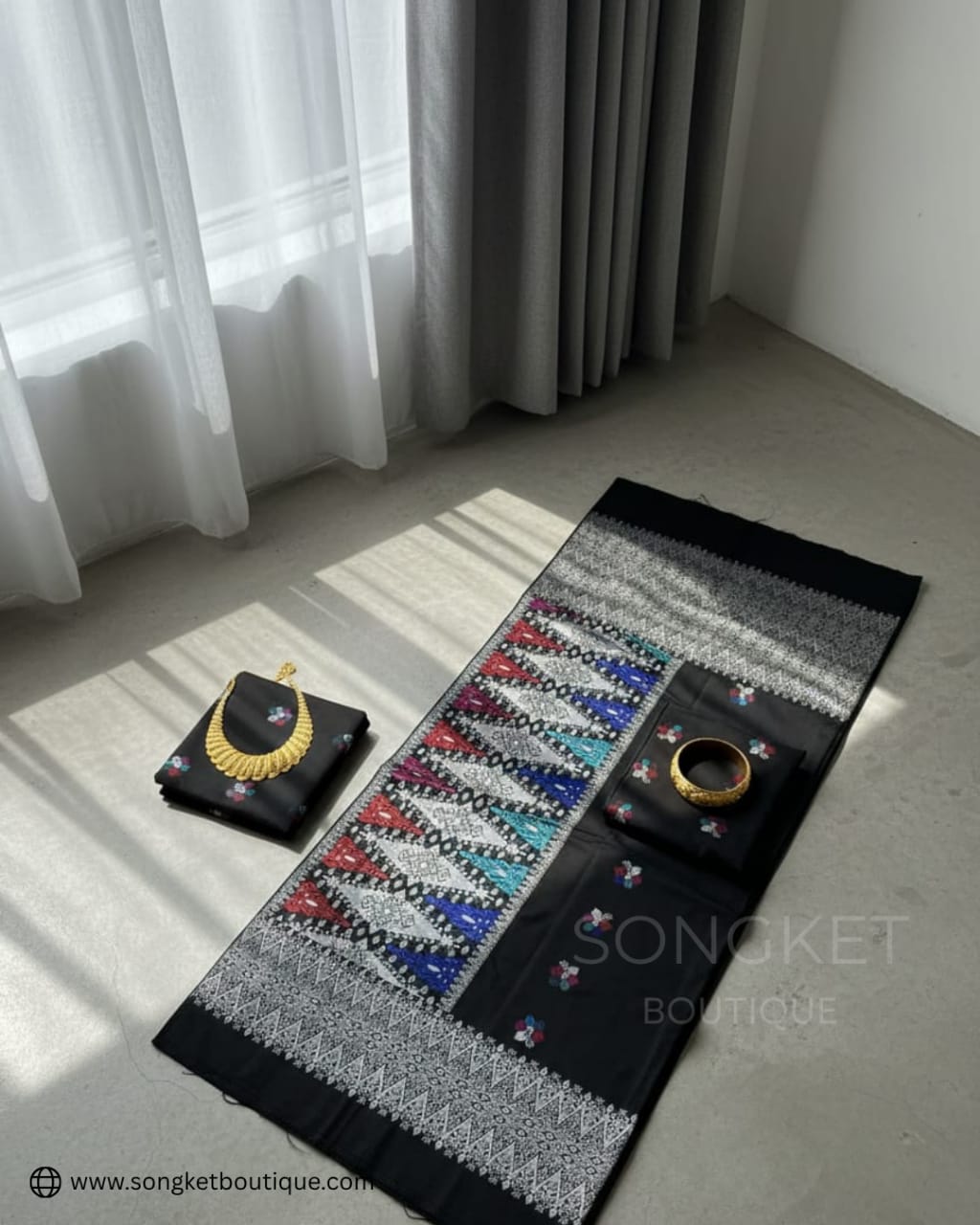 Koleksi Songket Tenun Premium Exclusive ini tampil mewah dengan warna Black Onyx yang elegan, moden dan penuh karakter. Border Multicolor Exclusive (merah, biru, emerald, turquoise) dipadankan dengan tenunan Silver Exclusive Grade, menghasilkan kombinasi tradisional dan moden yang benar-benar memukau dan high-class.