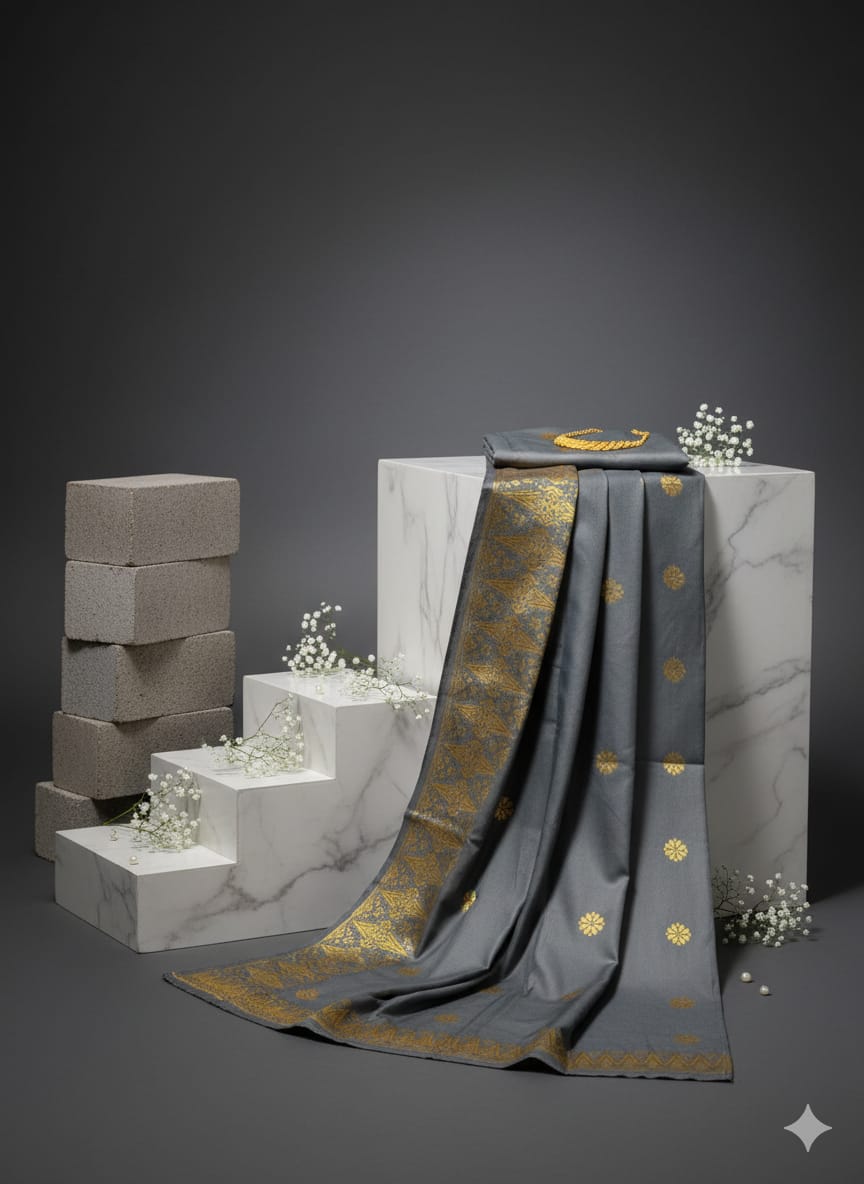 Koleksi Songket Tenun Premium ini hadir dalam warna Grey Charcoal yang sangat moden dan eksklusif, dipadankan dengan tenunan Gold Metallic yang menyerlah tetapi tetap classy. Motif Bunga Tabur yang tersusun kemas memberi sentuhan elegan minimalis, manakala border songket penuh menambah aura tradisional yang mewah.