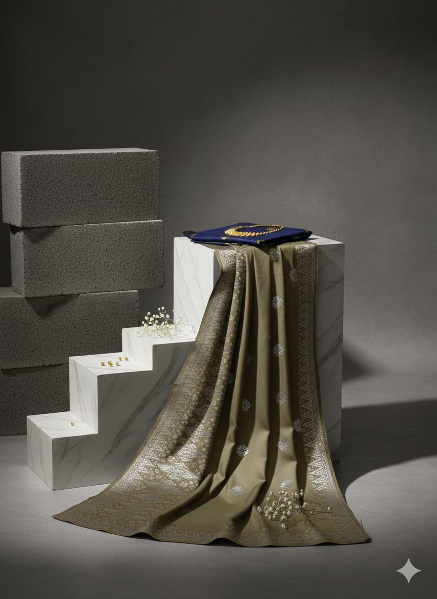 Songket Tenun Premium – Olive Green Silver (4.25m) Motif Bunga Tabur Eksklusif
