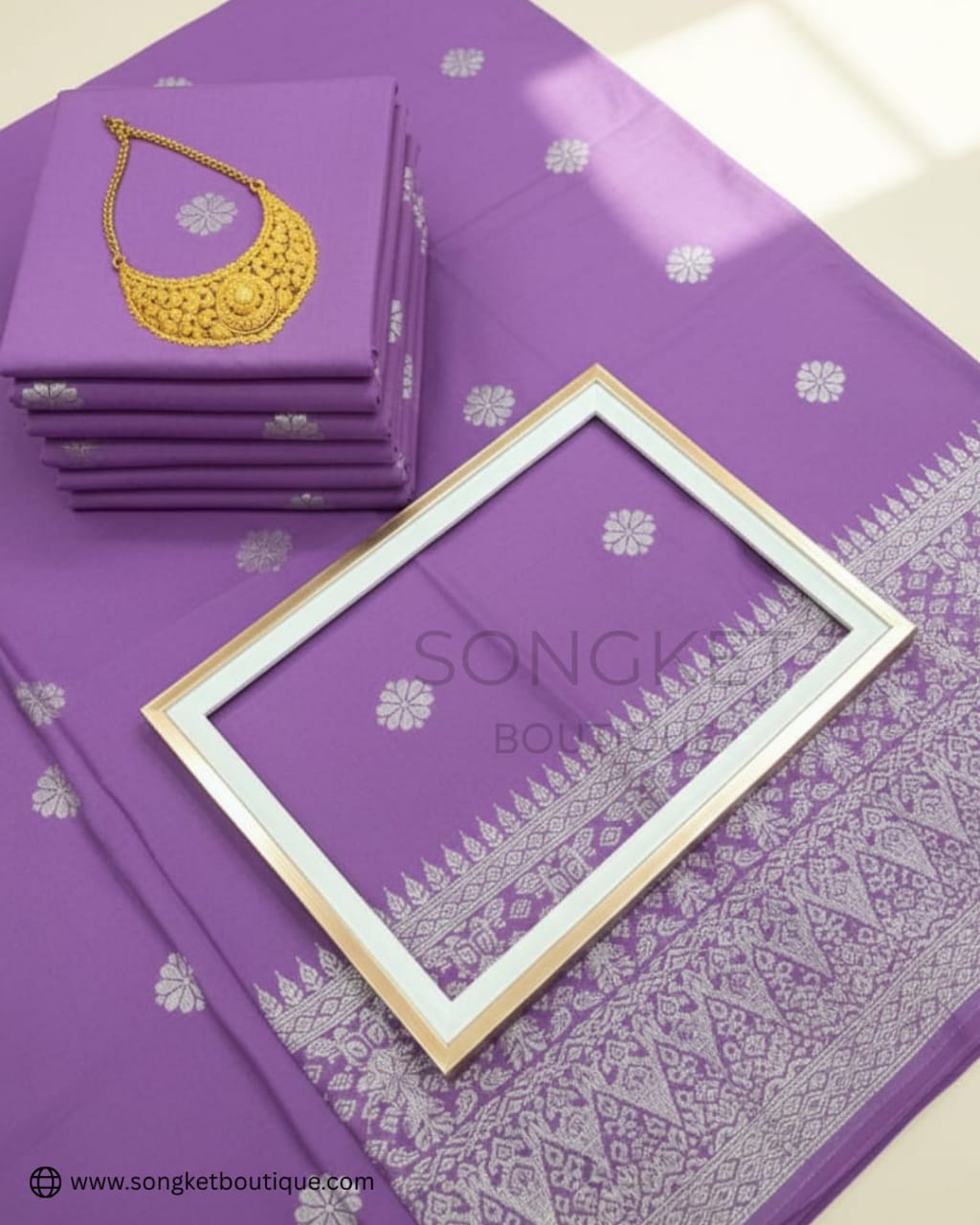 Koleksi Songket Tenun Premium ini hadir dalam warna Purple Royal yang memukau, digabungkan dengan tenunan Silver halus yang memberikan sentuhan mewah dan eksklusif. Motif Bunga Tabur yang minimalist namun elegan menghiasi keseluruhan fabrik, manakala border songket tradisional penuh menambahkan pesona klasik yang sangat cantik dipandang.