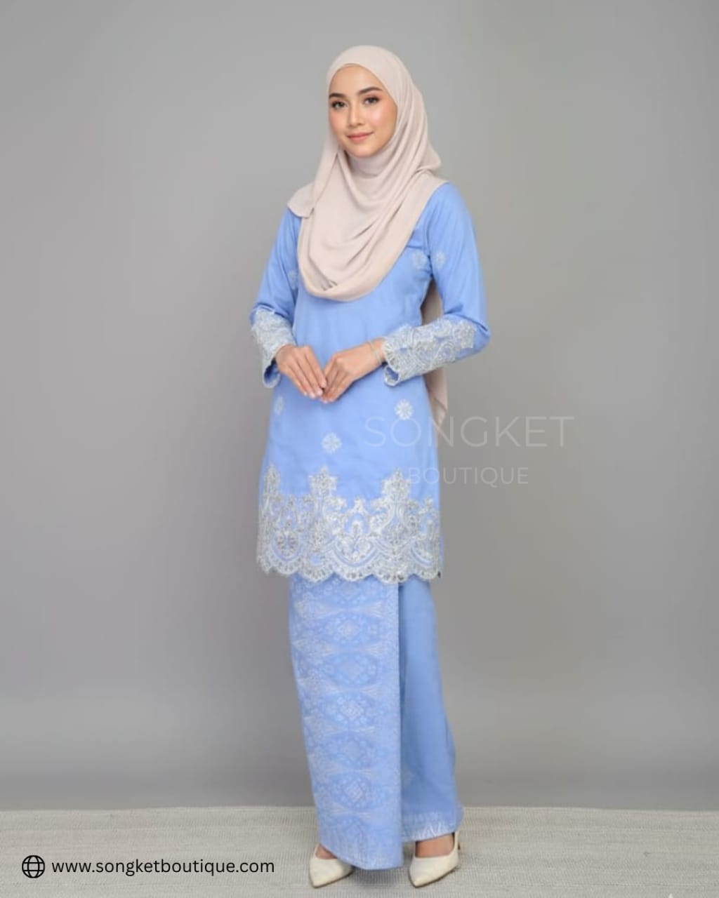 Warna baby blue ini sesuai untuk pelanggan yang inginkan look yang tenang, ayu dan eksklusif, sambil tampil sopan untuk pelbagai majlis istimewa.